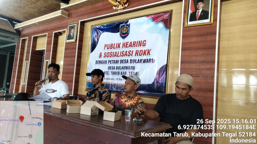 Bertempat di Balai Desa Bulakwaru, Mas Kades Muhamad Izam Zamzami mengundang para Petani dalam kegiatan Publik Hearing dan Sosialisasi RDKK, (Jum’at, 26/9/20250). Hadir juga Kasi Kesejahteraan Bapak Sopan yang membidangi pertanian dan Ketua Gapoktan Ustad. Mu’min, dan 45 (empat puluh lima) petani.